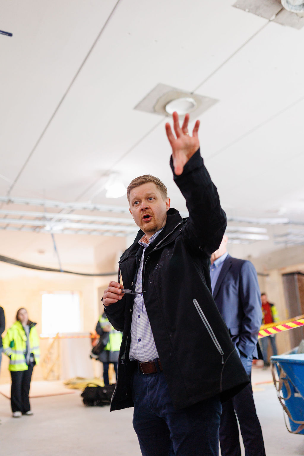 Kuvassa arkkitehti Tero Weman kertoo harjannostajaisvieraille monitoimitalon suunnittelusta ja rakennushankkeen etenemisestä.