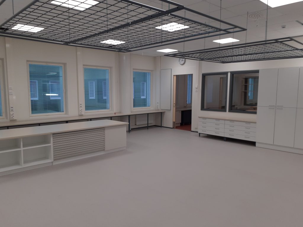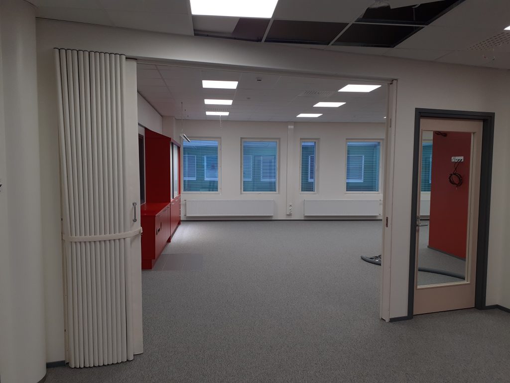 Kotitalouden oppimisympäristökin on jo viimeistelyvaiheessa. Kotitaloudella on kaksi samanlaista tilaa, joiden välissä on yhteinen kodinhoitohuone. Jokaisella opetuskeittiöllä oma värinsä.