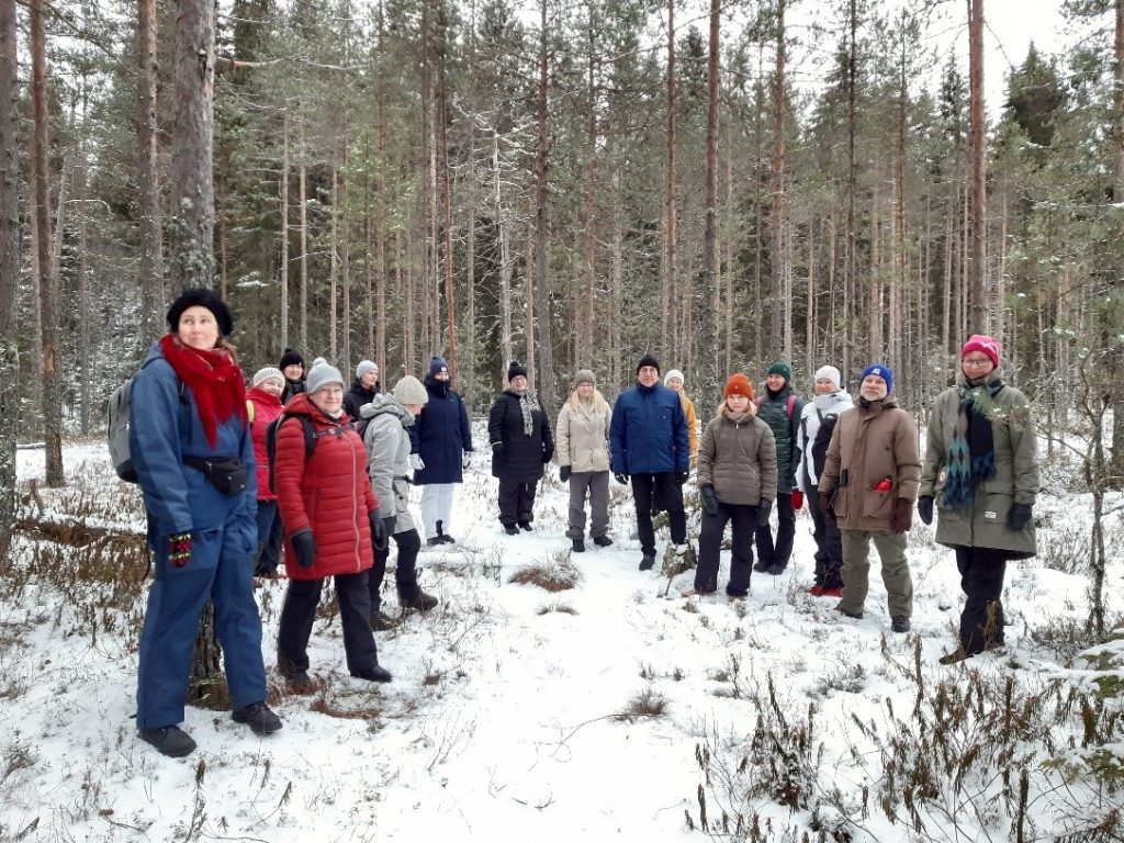 Retken lopuksi meillä oli tilaisuus tutustua Likolampea ympäröiviin Lahden taiteilijaseuran luomiin veistoksiin. Erityistä ihastusta synnytti vanha ”Aarrepuu” ja sen uusi asukas. Teoksen ovat aloittaneet Minna Alanko, Nelli Penna ja Kirsi Karppinen. Ohikulkijat voivat jatkaa teosta viemällä puun koloihin viestejä tai esineitä ja tutkia mitä sieltä kulloinkin löytyy muiden tuomana. Näin joulun alla Aarrepuuhun oli löytänyt tonttu, joka oli asettunut taloksi.