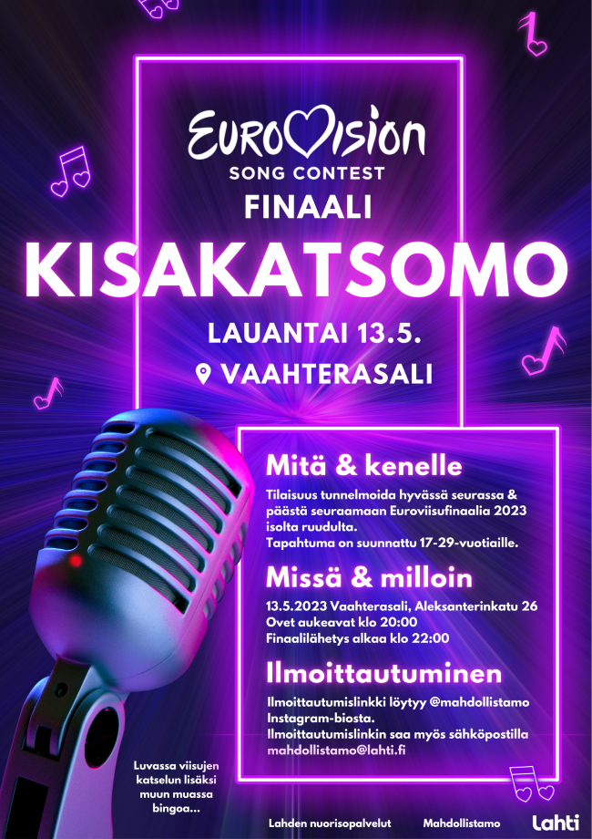 Euroviisukatsomoon tulee ilmoittautua ennakkoon 10.5.2023 mennessä Mahdollistamon Instagramin biosta löytyvän linkin kautta. Ilmoittautumislinkin saa halutessaan tilattua myös sähköpostitse osoitteesta mahdollistamo@lahti.fi. Tilaisuudessa noudatetaan turvallisen tilan sääntöjä ja se toteutetaan yhteistyössä Lahden kulttuuripalveluiden ja Seta ry:n kanssa.