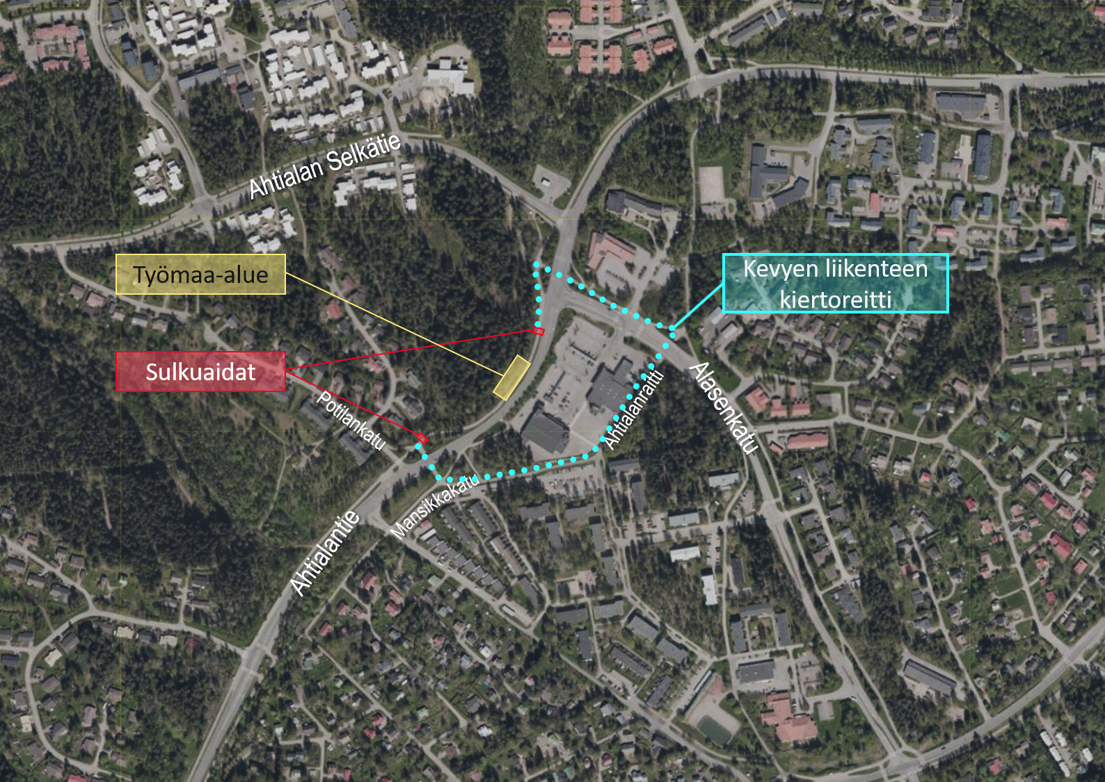 Ahtialankeskuksen kohdalla kevyen liikenteen yhteys välillä Potilankatu-Alasenkatu on kiertoreitillä toukokuussa 10.-28.5. välisen ajan. Nykyinen yhteys on katkaistu sulkuaidoilla ja kiertoreitti on merkitty maastoon. Sulun kohdalla tehdään kallioseinämän verkotusta ja turvallisuuden vuoksi kevyt liikenne ohjataan käyttämään toista reittiä.