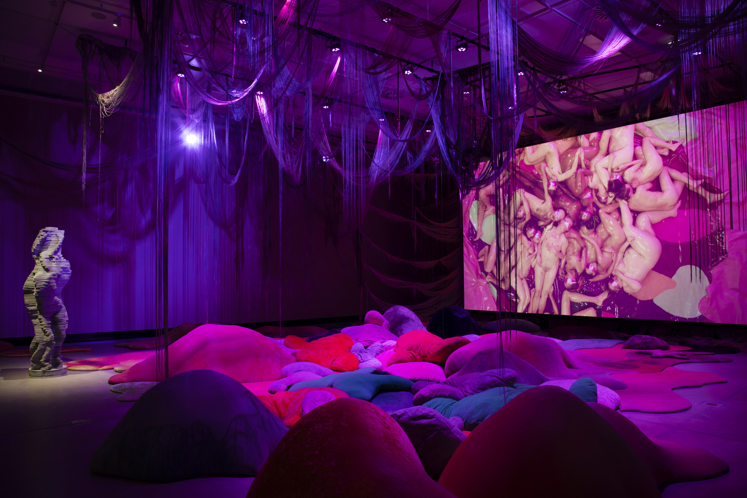 Venezuelalaisen elektronisen musiikin supertähden Arcan ja japanilaisen taiteilija Jesse Kandan videoinstallaatio keskittyy mutatoituneisiin kehoihin ja psykologisiin jännitteisiin.