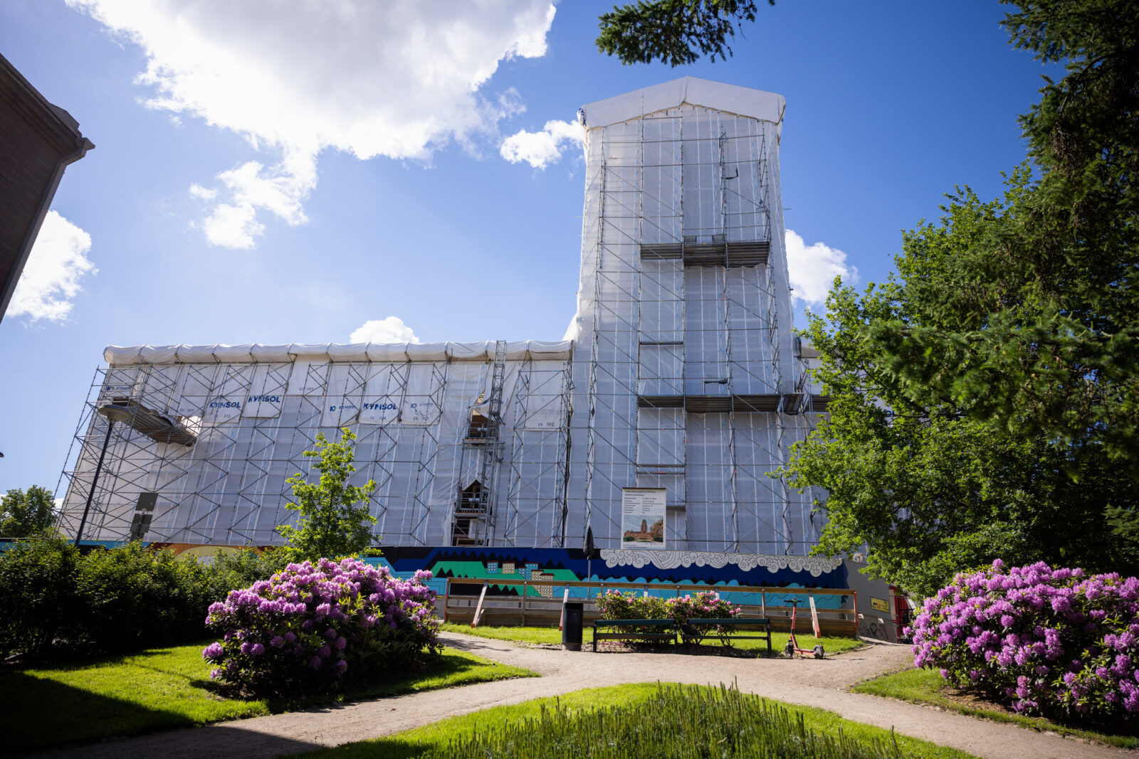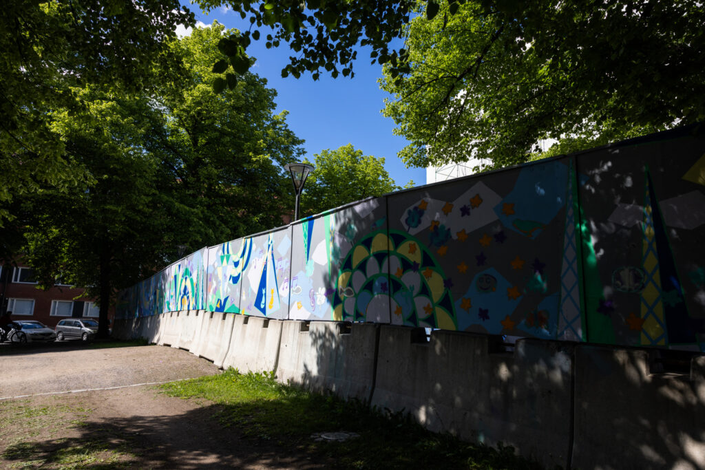 Kaupungintalon puiston puoleisen teoksen Elämän kestävät rakenteet ovat toteuttaneet Kauno ry:n Kirsi Karppinen ja Nelli Penna yhdessä Harjun koulun valinnaisen kuvataiteen oppilaiden kanssa. Mariankadun puolelle teoksen Juuret on toteuttanut Inspis ry:n Juuso Haverinen. Teokset on toteutettu kierrätetyille vaneriaidoille. Molemmissa teoksissa nousevat esiin kestävän kehityksen teemat.