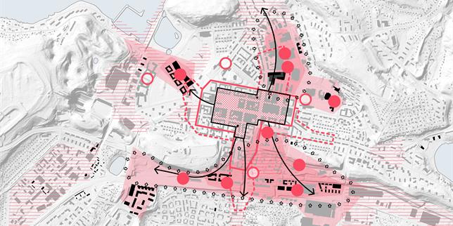 Tiedotteen kuvassa on luonnos keskustavision elivoima-teemakartasta. Kartassa näkyy mihin suuntiin Lahden keskusta tulevaisuudessa laajenee. Kuva: kaavoitusarkkitehti Markus Lehmuskoski.