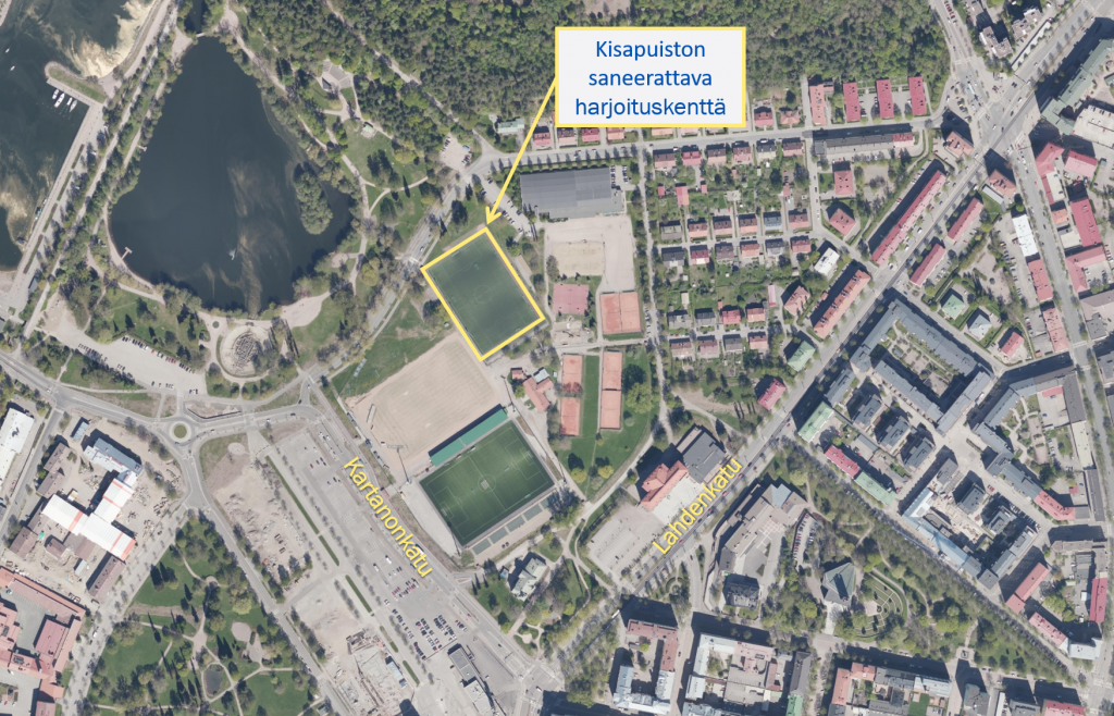 Kisapuistossa on kaksi tekonurmea, saneerauksen kohteena on pohjoisempi kenttä eli harjoituskenttä. Harjoituskenttä on osoitettu ilmakuvassa keltaisella rajauksella.
