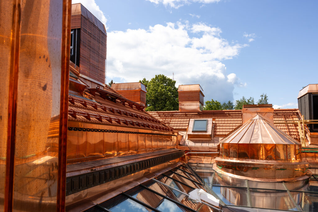 Umpikaton materiaaliksi valikoitui lopulta patinoitunut kupari. Yhdessä hoikkien pilareiden kanssa se muodostaa yhtenäisen kappaleen, joka synnyttää valon ja akustiikan keinoin voimakasta tunnelmaa sisäpihalle.