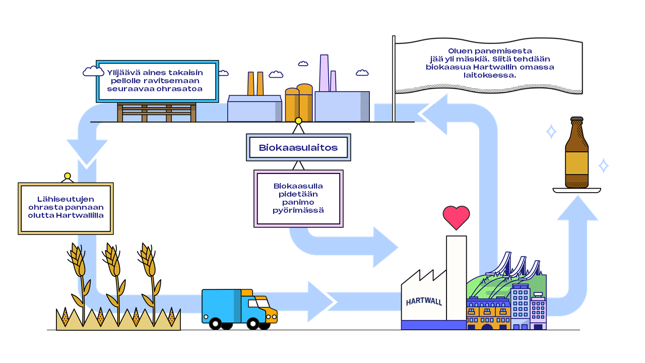 –Jatkossa oluenkeitossa käytettävä ohra tekee täyden kierroksen: oluenpanemisen sivutuotteena syntyvästä mäskistä tehdään biokaasua. Prosessista ylijäävä ohrapohjainen aines palautetaan pellolle ravitsemaan seuraavaa ohrasatoa, joka aikanaan päätyy meille olutkattilaan”, kertoo tuotanto- ja toimitusketjun johtaja Tomi Korte Hartwallin tiedotteessa.