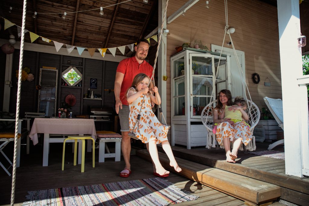 Tala-Kujala toimi aiemmin kaupan alalla, nyt hän odottaa kolmatta lasta ja on äitiyslomalla omasta ompelualan yrityksestä. Aadalla, 6, ja Ainolla, 4, on omassa pihassa leikkimökki, keinut ja tilaa leikeille myös ulkorakennuksen katoksessa. Kavereita löytyy lähitaloista ja puistoista, ja korona-aikaankin pihalla on voinut viettää syntymäpäiviä. Naapuruston isommat lapset voivat kulkea itsekseen turvallisella alueella.