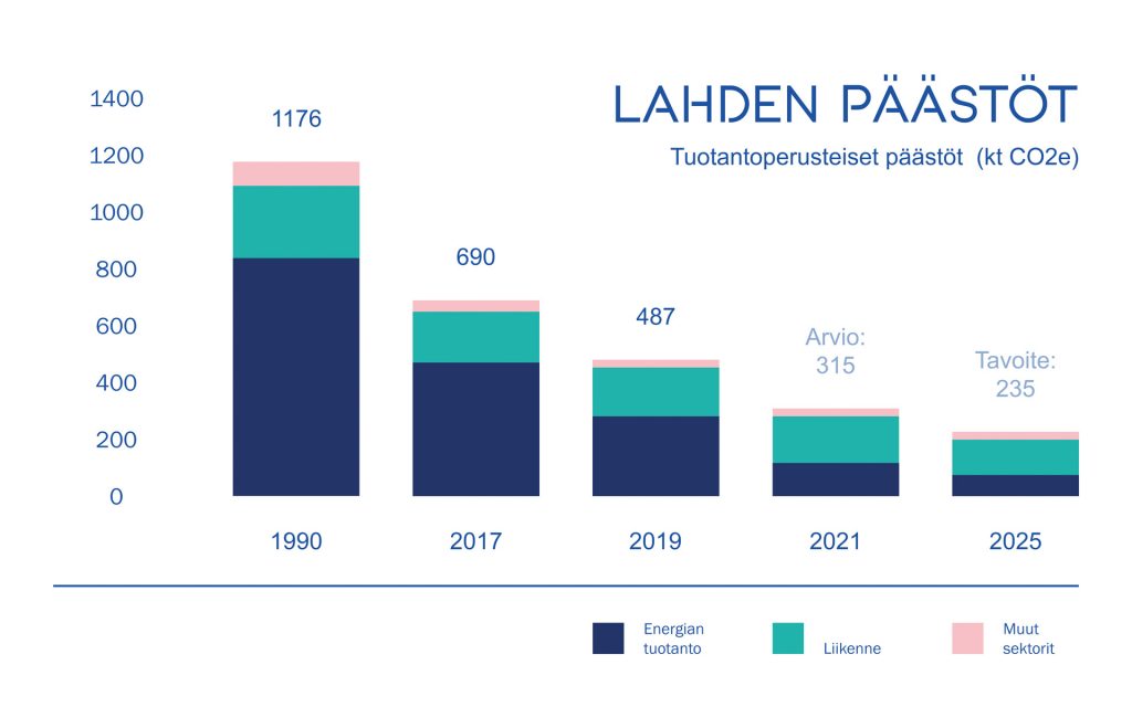 Lahden tämänvuotisten päästöjen arvioidaan olevan jo 70 prosenttia pienemmät kuin vuonna 1990. Vuoden 2020 virallisia lukuja ei ole vielä käytettävissä.