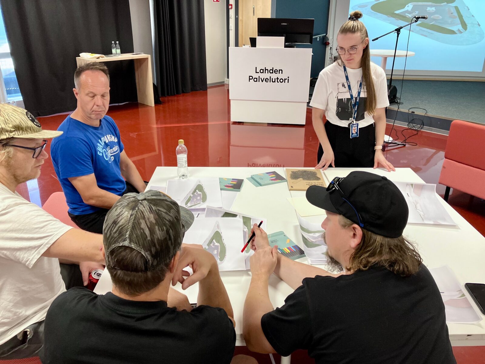 Esittelyn jälkeen työpajaan osallistujat pääsivät itse kirjaamaan ja piirtämään parannusehdotuksia luonnoksiin. Luonnoksiin oltiin tyytyväisiä ja osallistujien asiantuntevat kommentit tarttuivat vain pieniin yksityiskohtiin.