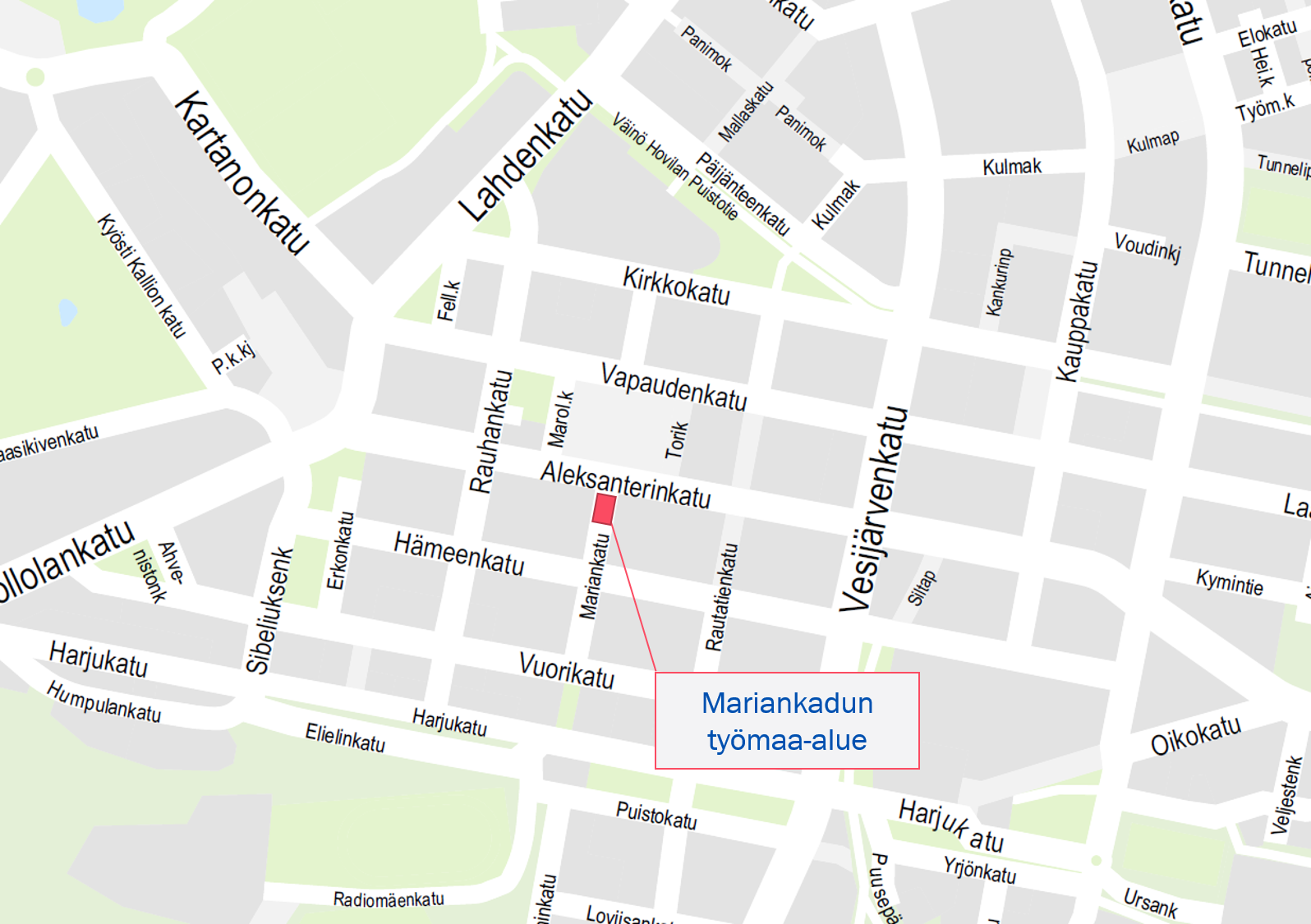 Mariankatu Hämeenkadun ja Aleksanterinkadun väliseltä alueelta on arviolta seuraavan kuukauden ajan työmaa-aluetta. Kaikki liikenne Hämeenkadun suunnasta aukiolle on katkaistu työn ajaksi. Pelastusajo ja välttämätön huoltoliikenne on mahdollista Aleksanterinkadun suunnasta. Taksiliikenne kiinteistöille toteutuu Aleksanterinkadun puolelta. Alueella ajoa pyydetään välttämään.