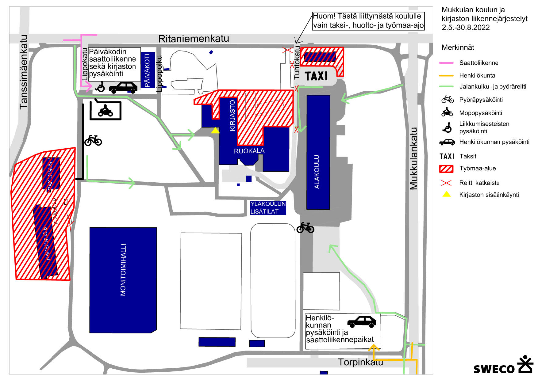 Päiväkodin saattoliikenne ohjataan Lippokadulle. Koululaisten saattoliikenne ohjataan väliaikaisesti Torpinkadulle opasteiden mukaisesti.