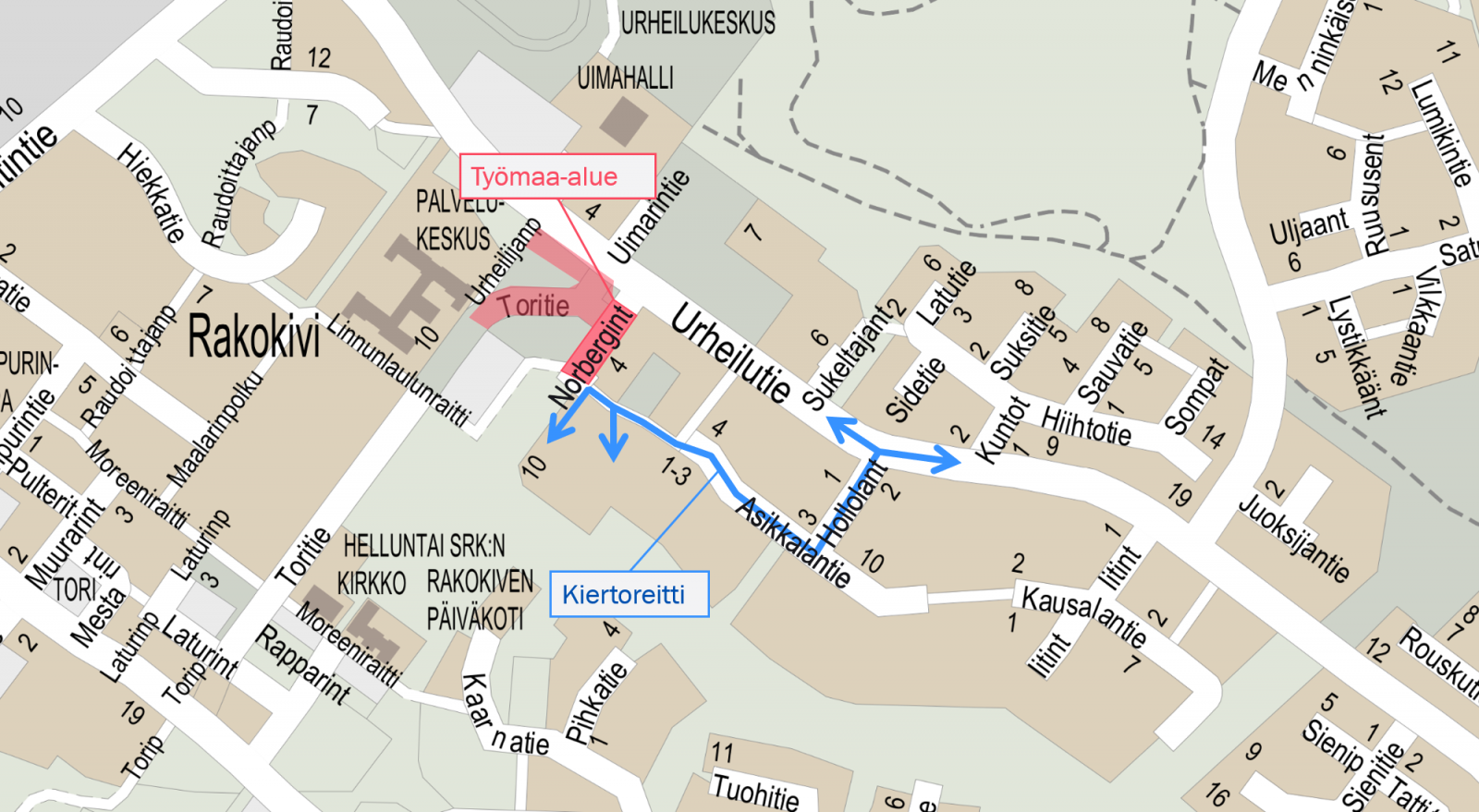 Työn alkuvaiheessa Norbergintie 4:n kiinteistölle pääsee vielä normaalisti. Norbergintien ja Urheilutien risteys avataan rakennustyön edetessä, jolloin myös Norbergintie 4:n kiinteistölle kuljetaan kiertoreittiä pitkin. Kadun muille kiinteistölle kuljetaan koko Norbergintien työmaan ajan kiertoreittiä Asikkalantie-Hollolantie-Urheilutie. Kiertoreittien muutoksista tiedotetaan asukkaita lähempänä muutoksen ajankohtaa.