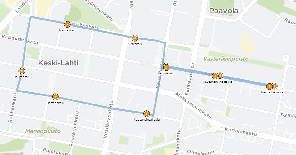 Alku- ja päätepysäkki sijaitsevat Wanhalla Herralla. Muut pysäkit ovat Kaupunginkirjasto, Kauppakatu, Kaupunginsairaala, Hämeenkatu, Rauhankatu, Ristinkirkko ja Kirkkokatu.