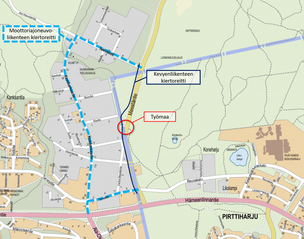Rakentaminen alkaa viikolla 15 ja työn arvioidaan valmistuvan kokonaisuudessaan syykuun 2021 aikana. Messiläntien liikenteen katkaisu on 28.4.21-17.8.2021 välisenä aikana.