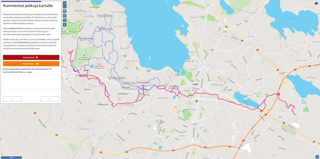 Uusia maastoliikuntapolkuja käsittelevä karttapohjainen verkkokysely oli avoinna 20.9.-3.10.2021. Verkkokyselyssä vastaajat saattoivat kommentoida suunnitteilla olevia maastoliikuntapolkulinjauksia ja vaihtoehtoisia linjauksia suoraan kartalle. Kyselyssä oli mahdollisuus antaa pistemäinen kommentti tai huomio sekä linjamainen uusi polku tai vaihtoehtoinen linjaus polulle. Kaikkia karttamerkintöjä oli mahdollisuus vielä tarkentaa sanallisesti.