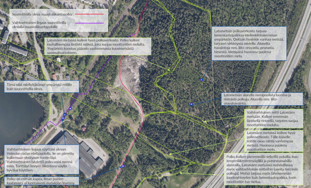 Kyselyn ja verkkotilaisuuden lisäksi suunnittelijat ovat saaneet maastoliikuntapolkuihin liittyvää palautetta ja kommentteja sähköpostitse ja puhelimitse. Kaiken kaikkiaan palautetta on saatu runsaasti ja saadut kommentit huomioidaan mahdollisuuksien mukaan maastoliikuntapolkujen linjauksissa, merkitsemisissä sekä kunnossapidossa. Kiitos kaikille!