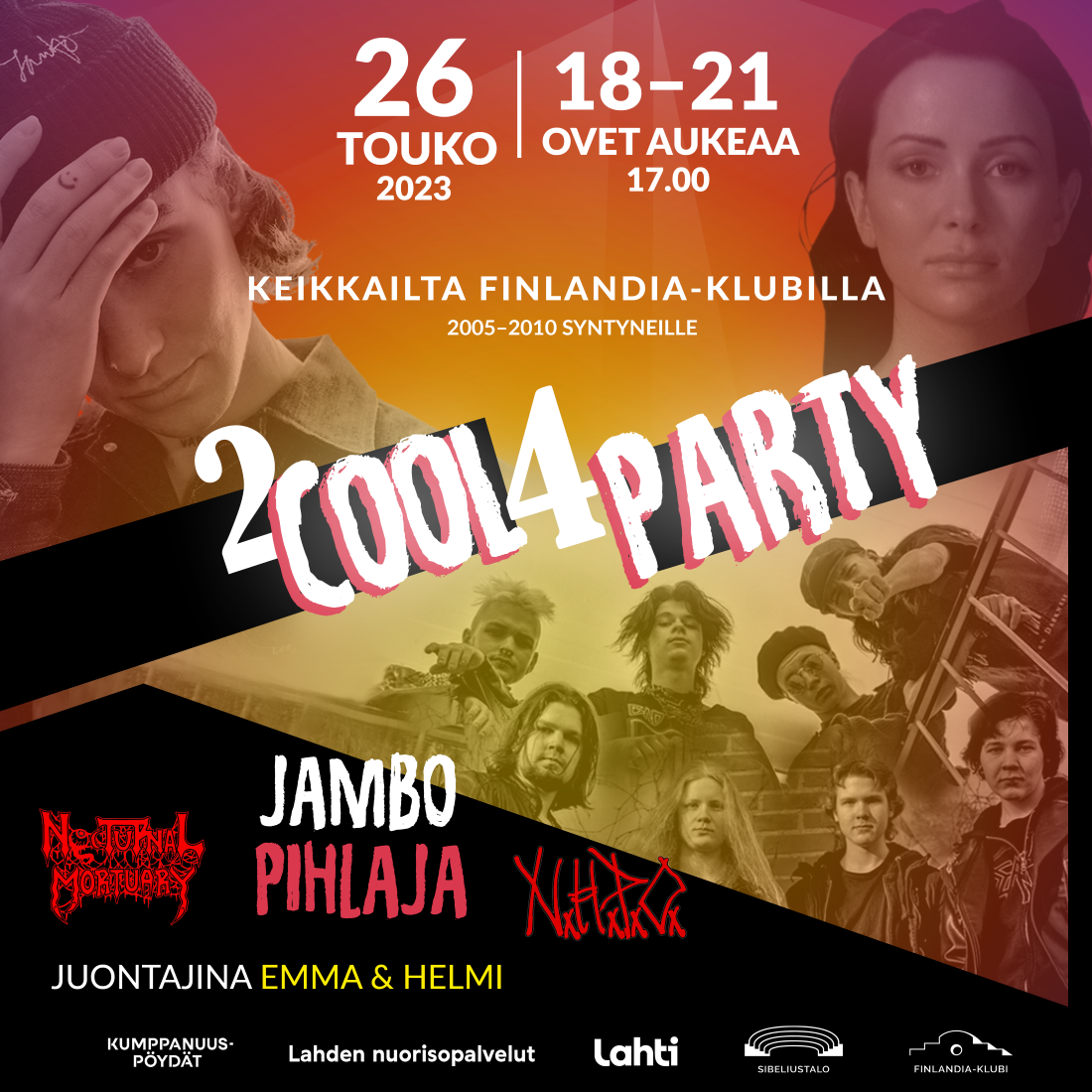 Lahden kaupungin kumppanuuspöydät järjestävät yhteistyössä nuorisopalveluiden kanssa perjantaina 26.5.2023 klo 18–21 Sibeliustalon Finlandia-klubilla vuonna 2005–2010 syntyneille nuorille suunnatun päihteettömän ja maksuttoman tapahtuman, 2COOL4PARTY. Illan pääesiintyjinä nähdään Pihlaja sekä jambo.