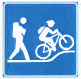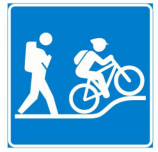 Sinipohjainen luontoliikuntapolun merkitsemiseen käytetty merkki, jossa on esitetty valkoisella retkeilijän ja maastopyöräilijän symbolit.Yhteiskäyttöpolun kulkutapasymboli johdattaa ulkoilijan merkityille poluille.
